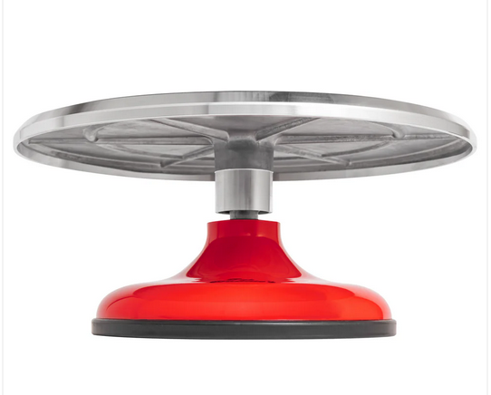 Whether you are a hobbyist baker or a professional decorator at a bakery, this multi-use stand's wide and heavy-duty, non-slip base is equipped with rubber feet to maintain stability on kitchen counters, ensuring your confectionery creations stay put while you add the details. This premium revolving cake stand is designed to bring your baked cakes and pastries to life by allowing for easy decoration from every angle. Great for use with a cake comb and cake board. It is built to last and easy to clean no matter how you swivel, rotate, or spin it. Easy to clean, handwash recommended.